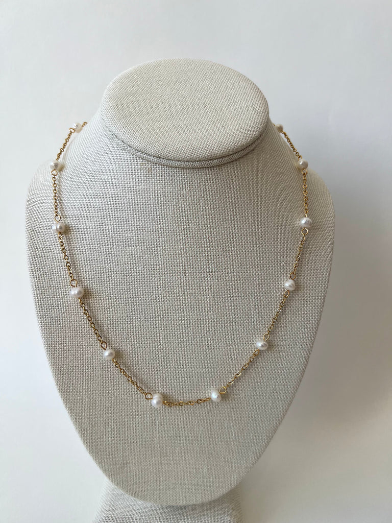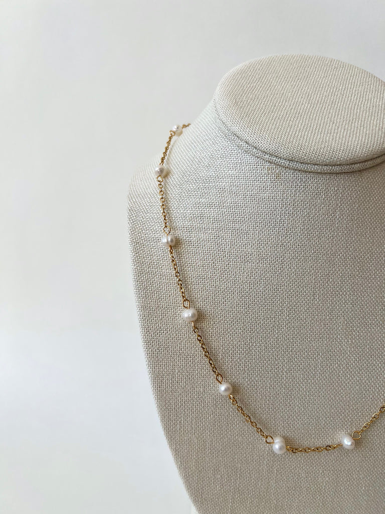 A dainty pearl necklace perfect for stacking with other pieces. This necklace is 18k gold plated stainless steel making it hypoallergenic and tarnish free! The length is (460 mm + 50 mm) making it fit more like a choker necklace.