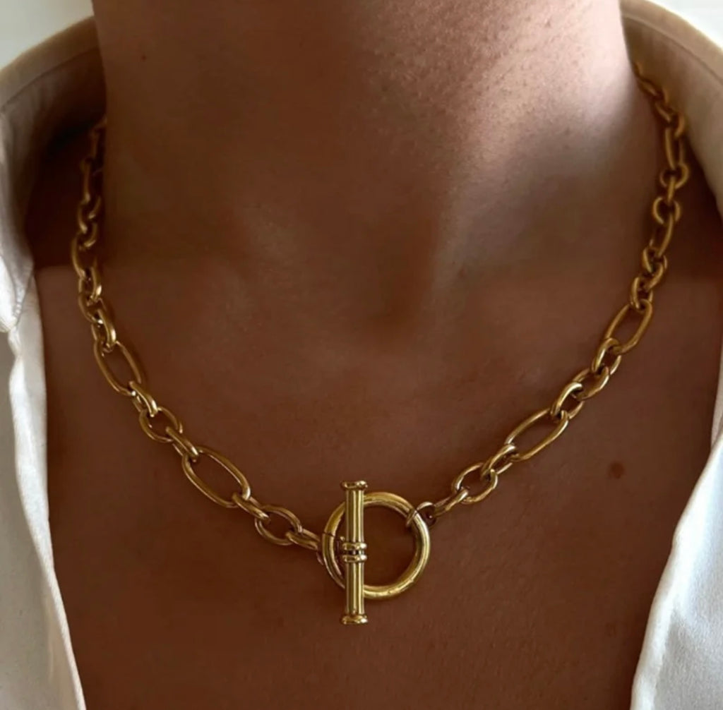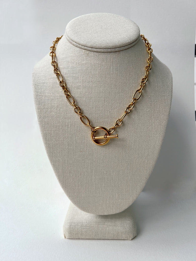 Perfect chunky necklace for layering! Non tarnish, 18k gold plated stainless steel making it perfect to wear all the time. The toggle also adds a cute detail to make the necklace stand out while layering it with simple necklaces or wearing it on it's own!